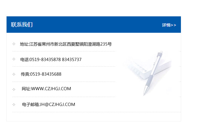 地址:常州市新北區友邦商務大廈1幢16、17層  電話:0519-85101652  傳真:0519-85112595  郵編:213022  網址:www.cz-jiayue_cn.xnglass.com  郵箱:xiajifengaa@163.com